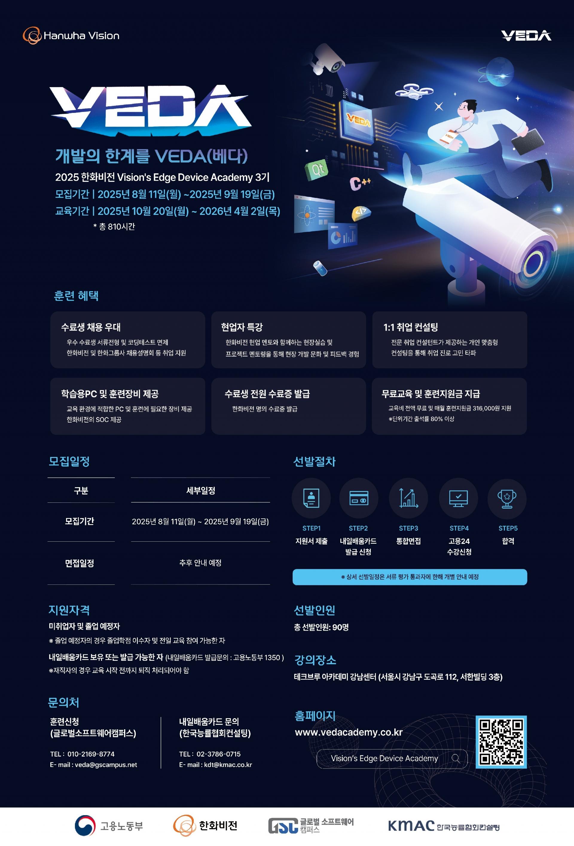 📌 교육생 특별 혜택 1. 우수수료생 한화비전 서류 전형 및 코딩테스트 면제 2. 한화비전 및 한화그룹 채용설명회 등 취업지원 3. 한화비전 멘토와 함께하는 현장실습, 프로젝트 멘토링 4. 무료 교육 및 매월 훈련 장려금 316,000원 지원 (*단위기간 출석률 80%이상) 5. 훈련에 적합한 PC와 장비 제공 6. 전문 취업 컨설턴트의 1:1 취업컨설팅 *기타 상세 혜택은 홈페이지 참고