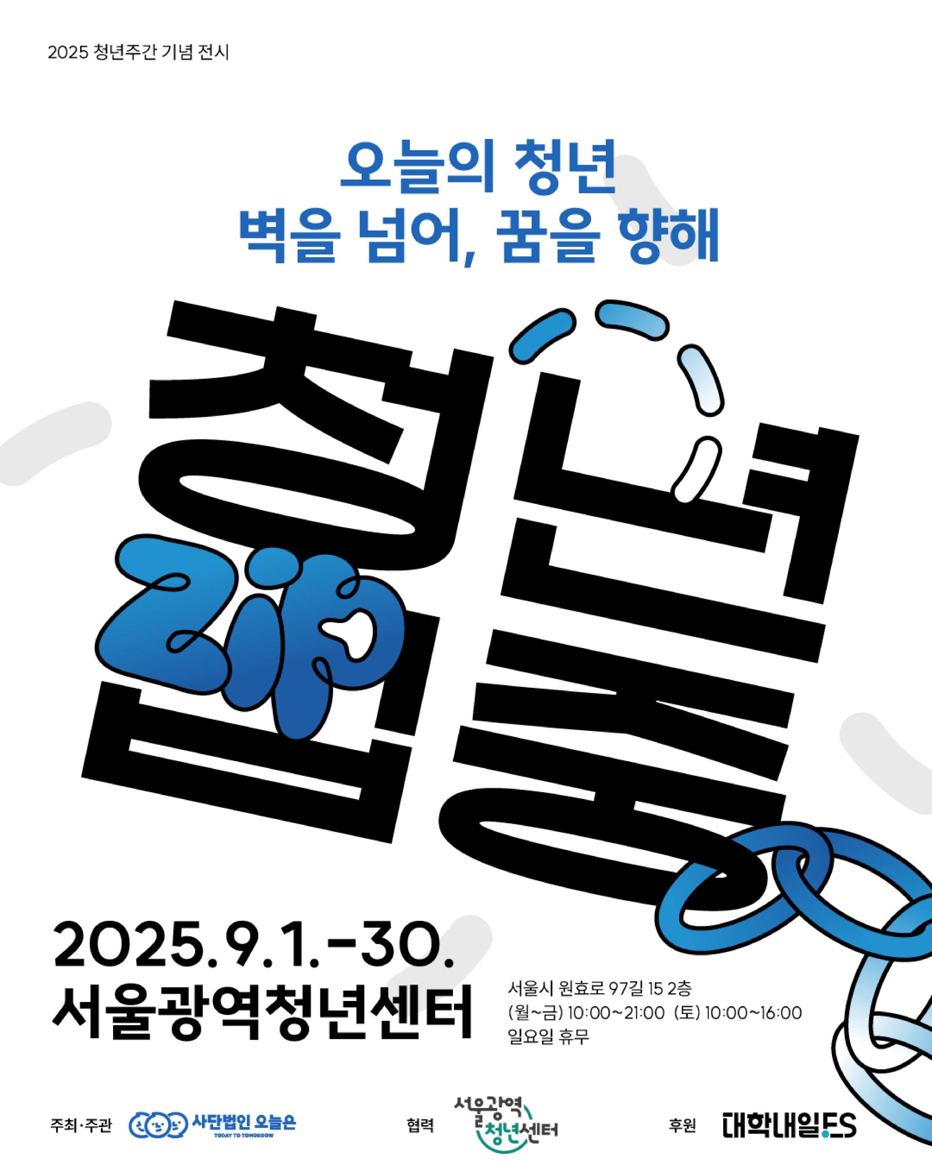 <청년ZIP중 예술전시회>📌 전시회 기간 : 2025. 9. 1. (월) ~ 9. 30.(화)※ 운영시간 : 평일 10:00 ~ 21:00 / 토요일 10:00 ~ 16:00퀴즈이벤트를 통한 경품 증정📌 영화상영 기간 : 2025. 9. 10.(수) ~ 9. 20.(토)📌 감독님과의 만남 : 2025. 9. 12.(금) / 2025. 9. 19.(금) 15:00<청년 플리마켓>📌 플리마켓 기간 : 2025. 9. 26. (금) ~ 9. 27.(토)※ 9. 26.(금) : 19:00 ~ 21:00※ 9. 27.(토) : 13:00 ~ 16:00📌 장소 : 서울광역청년센터 커뮤니티광장