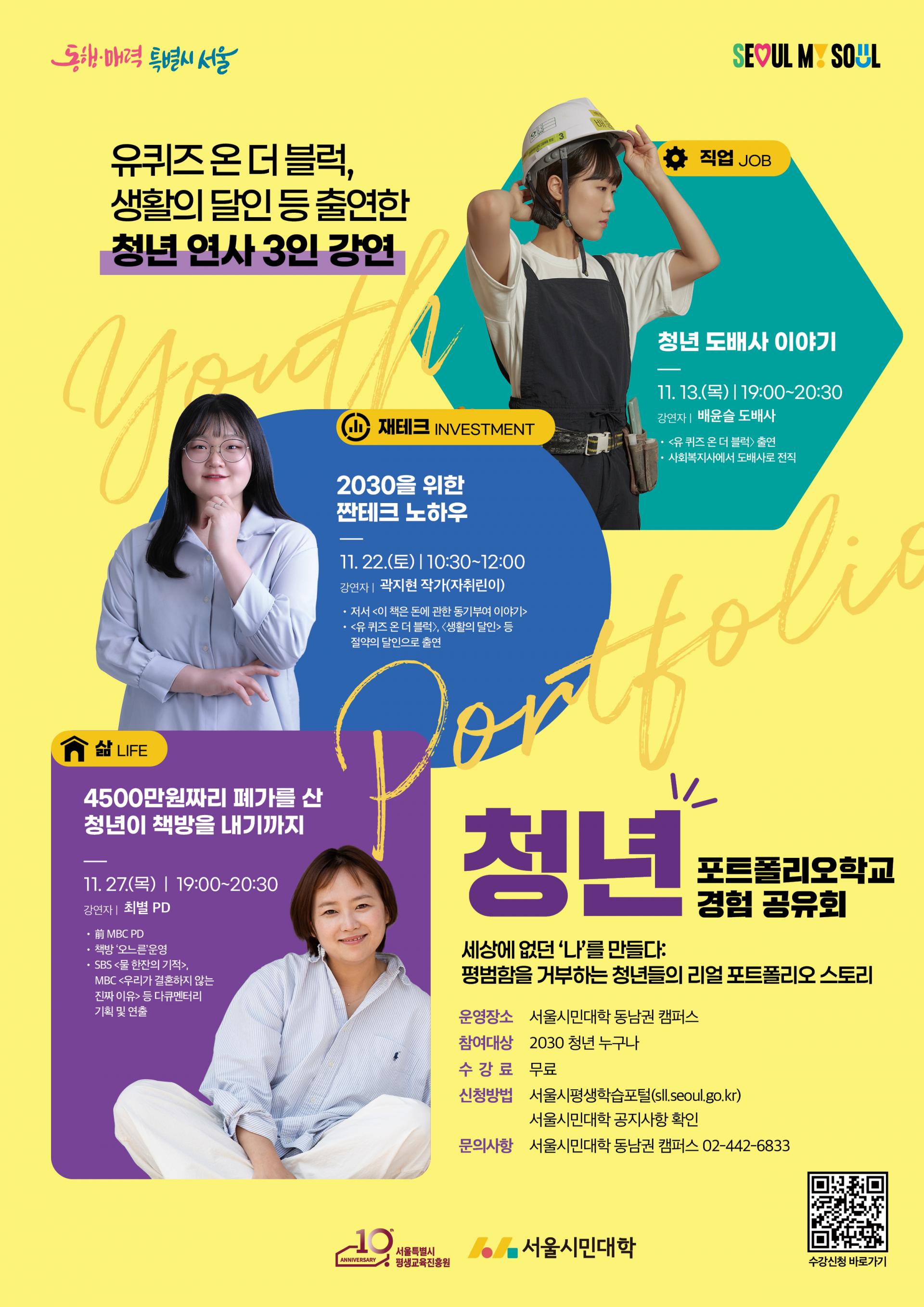 서울특별시평생교육진흥원 서울시민대학에서는 2030 < 청년들을 위한 청년포트폴리오학교 를> 운영하고 있습니다.