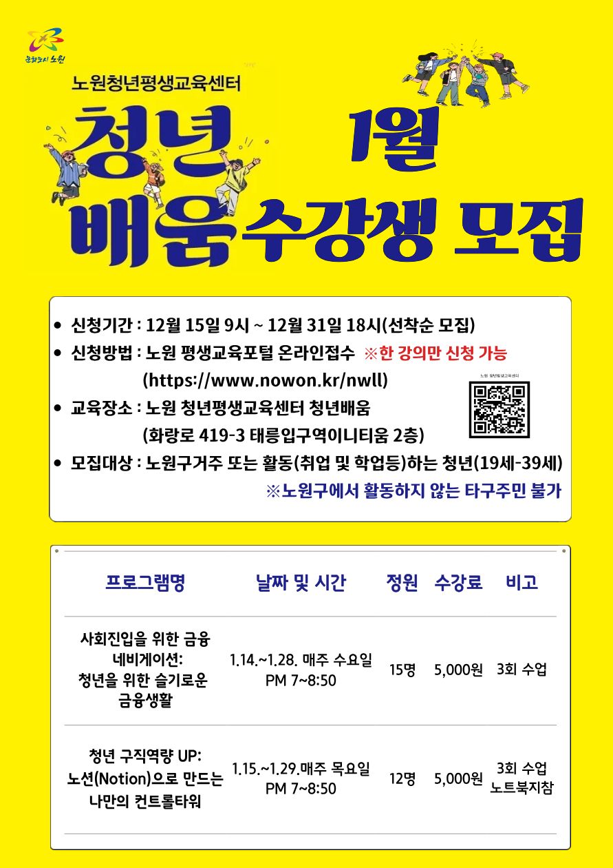 📢 청년내일🐋에서 전해드립니다<노원 청년평생교육센터 ‘청년배움’ 1월 프로그램 수강생 모집 안내>
