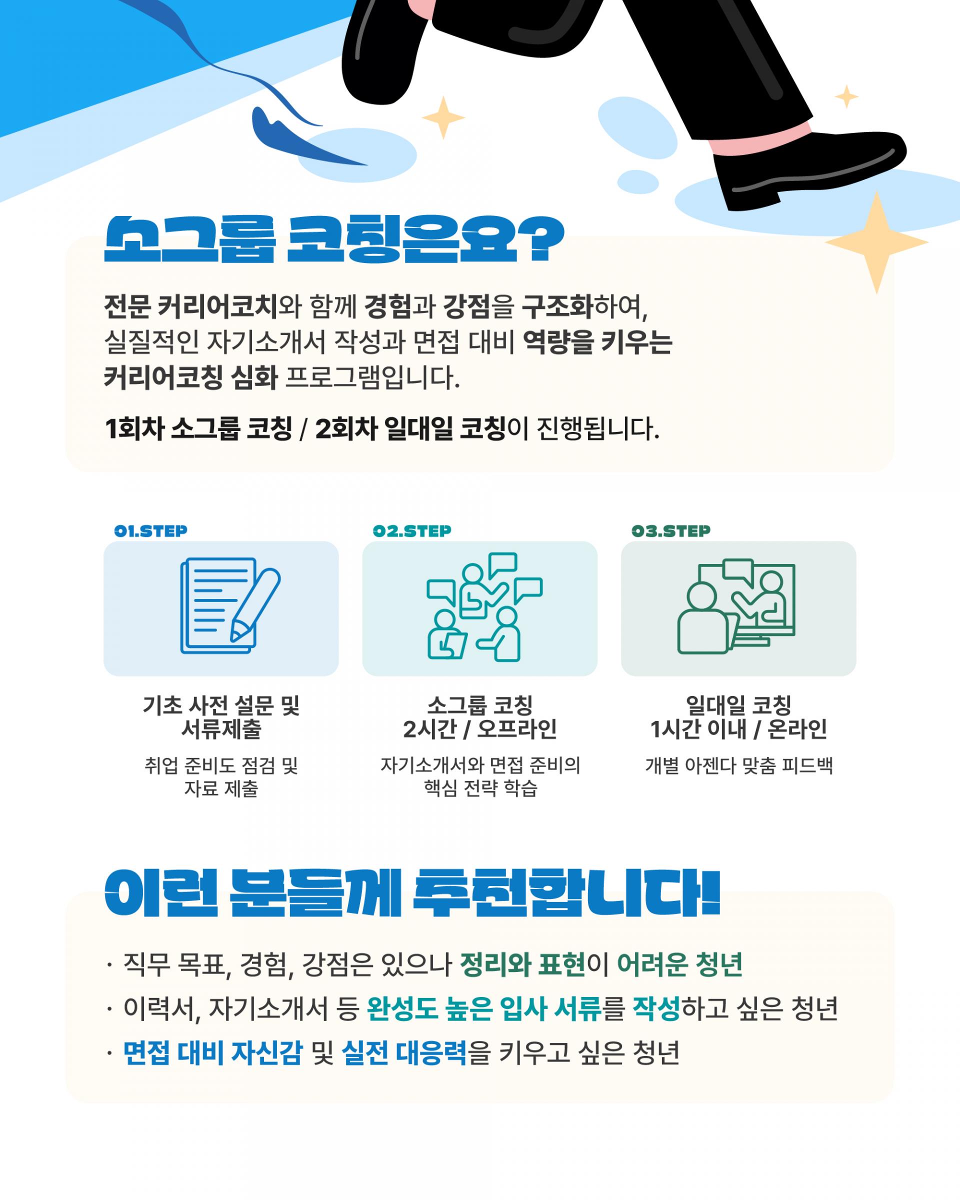 ✨청년 커리어 START 소그룹 코칭✨은 전문 커리어코치와 함께 경험과 강점을 구조화하여 실질적인 자기소개서 작성과 면접 대비 역량을 키우는 커리어코칭 심화 프로그램 입니다!!