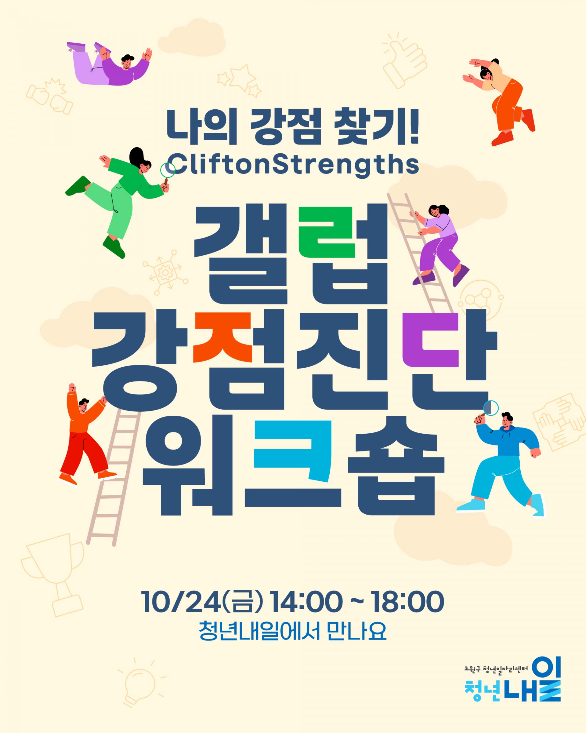 안녕하세요!청년내일 상담매니저 지니입니다~!🥰우리는 모두 고유한 재능을 가진 유일무이한 존재!나의 재능테마 발견과 이해를 통해 강점으로 활용해보는 시간 🧭청년내일에서 갤럽 강점 진단으로 나만의 강점 함께 찾아보아요😊📌 갤럽 강점 진단은요?!갤럽사의 클리프턴 박사가 개발한 지문과 같이 고유한 개인의 재능과 잠재력을 발견하여강점으로 발전시켜 나가는 재능테마 진단 도구 입니다.✔ 이런 고민을 가진 분들께 추천합니다!😊 나에 대한 이해와 자신감이 부족한 청년🙄 나의 강점과 잘 할 수 있는 일이 무엇인지 알고 싶은 청년😅 자기소개서나 면접에서 나만의 강점을 어필하고 싶은 청년🤩 삶과 일에서 지속적인 강점 개발 계획을 세워보고 싶은 청년⭐진행방법[STEP 01]사전 진단하기 : 갤럽 강점 진단 온라인 진행※ 프로그램 참여자로 선정되시면, 작성해주신 이메일 주소로 진단 코드를 보내드립니다.[STEP 02]함께 나누기 : 오프라인 프로그램에 참석하여, 전문가와 함께 강점레포트를 해석하고 내가 가지고 있는 커리어 고민을 나누기