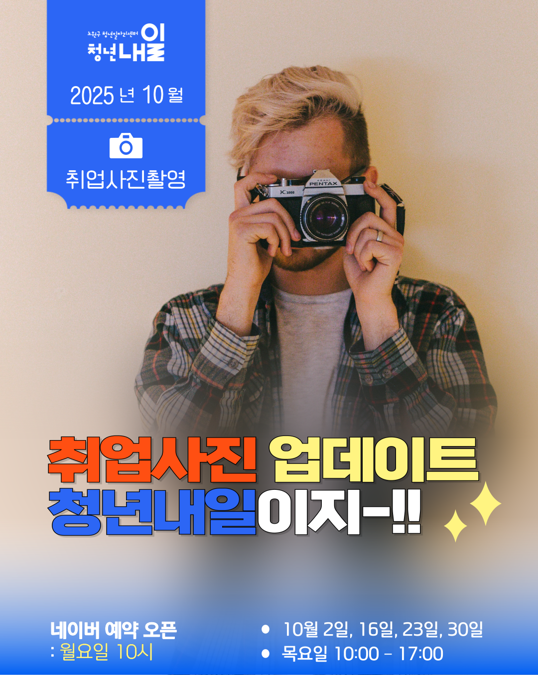 🧢언제 10/2(목) 10:00~18:00 10/16(목) 10:00~17:00 10/23(목) 10:00~17:00 10/30(목) 10:00~17:00 ❤️ 1인당 촬영시간은 약 1시간 + @ 소요됩니다 ❤️ 네이버 예약 시간과 실제 촬영 시작 시간이 다르니 문자를 꼭 확인해주세요.